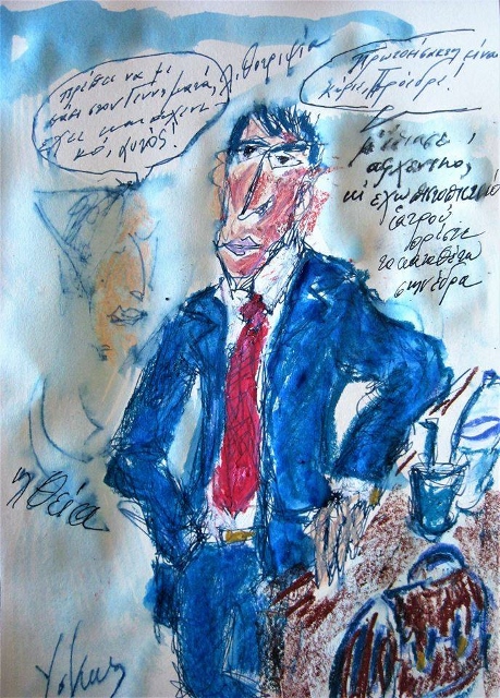 *Η ζωγραφιά: Ο καλός συνάδελφος, μετά της εριτίμου συγγενούς του, αναμένοντες το τέλος της δίκης και την απαρχή της υδροθεραπείας. Δια χειρός – αν και πολλοί το υποψιάζεστε – του αδερφού/λατρεμένου/καλλιτέχνη/και συναδέλφου βεβαίως-βεβαίως Βασίλη Γιοκουσκουμτζόγλου.