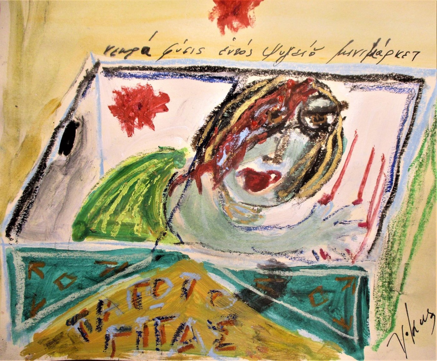 Υ.Γ. 1. Η ζωγραφιά, από τον μετρ της χαράς και της δροσιάς Βασίλη Γιοκουσκουμτζόγλου: Νεκρά φύσις εντός ψυγείου. Παστέλ και ακρυλικά σε χαρτί πολυτελείας.